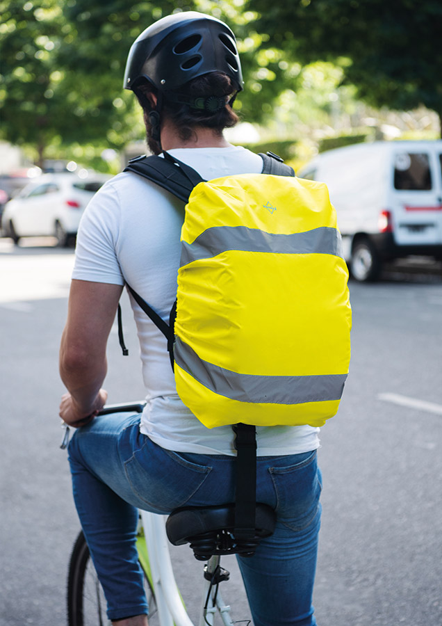 Praktischer Rucksacküberzug mit dekorativen Reflexstreifen Ideale Größe für die meisten Rucksäcke und Schulranzen Einfache Anbringung durch Gummizug Robuster Stoff aus 100 % 300D Oxford Polyester Wasserdicht durch verschweißte Nähte, Wassersäule 8000 mm Bedruckbar Einheitsgröße 54 x 16 x 28 cm