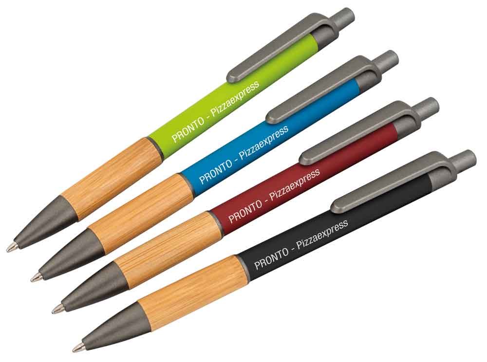 Dauerhafte Laserung - Bambusgriff-Manschette und anthrazitfarbener Metallclip - in modischen Farben Material: Metall / BambusMinenfarbe: Blau Werbeaufdruck: 1-farbigWerbefläche: 63 x 8 mmGravurverfahren: Lasergravur
